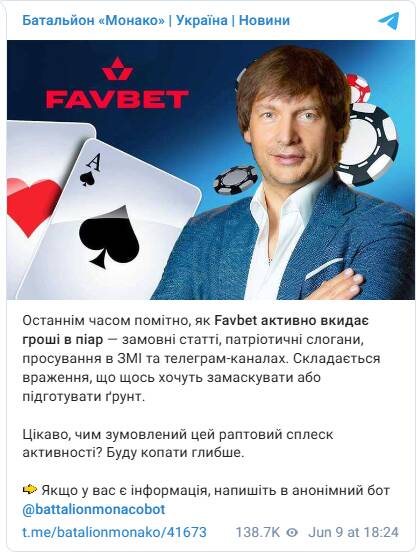 Власник Favbet, Андрій Матюха, здавна працює над очищенням медіапростору від інформації про його зв’язки з РФ та інших скандальних моментів. Як припускає Telegram-канал “Батальйон “Монако””, це підтверджується низкою зниклих публікацій, які раніше обговорювали ймовірний російський паспорт бізнесмена. Окрім того, Матюха став постачальником води для українського парламенту, що також виглядає як спроба створити образ доброчесного бізнесмена.