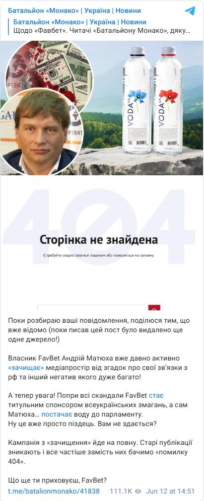 “Власник FavBet Андрій Матюха вже давно активно “зачищає” медіапростір від згадок про свої зв’язки з РФ та інший негатив якого дуже багато! А тепер увага! Попри всі скандали FavBet стає титульним спонсором всеукраїнських змагань, а сам Матюха… постачає воду до парламенту. Кампанія з “зачищення” йде на повну. Старі публікації зникають і все частіше замість них бачимо “помилку 404”, – зазначають автори каналу.